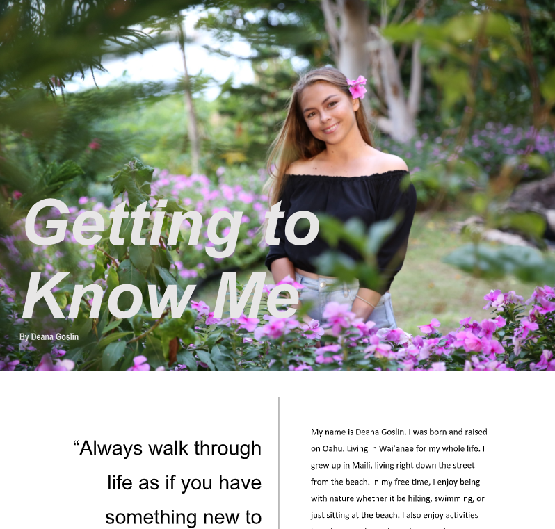 My magazine is about myself, my college experience, and my goals. It is a collection quotes, pictures, and texts that represent me. I share about my learning experience attending Leeward Community College and encourage the audience to attend college.